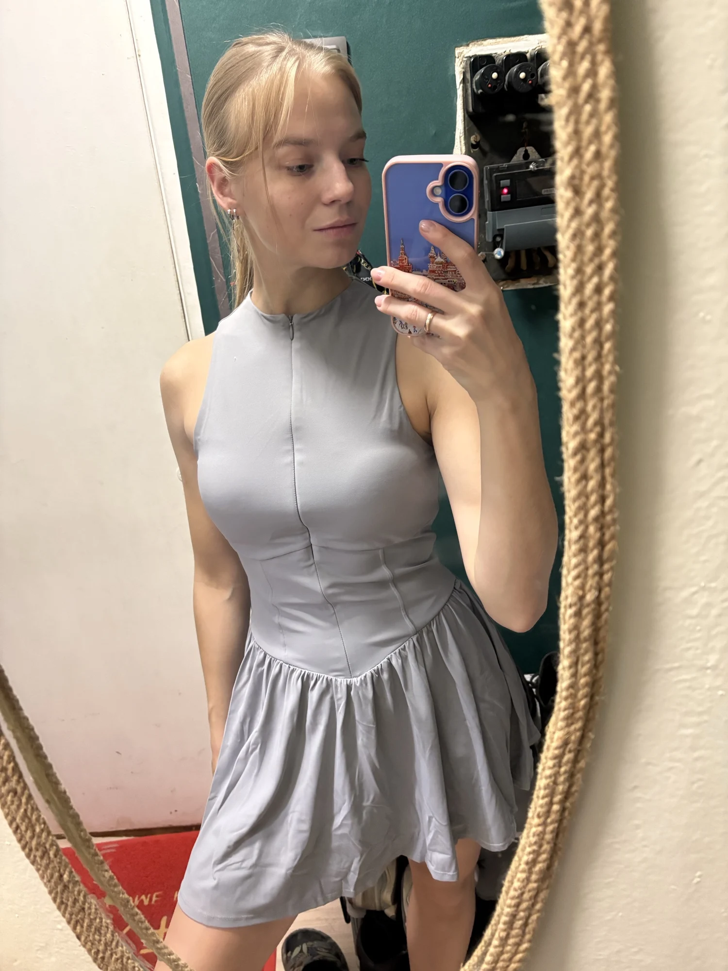 Dorsey G. Excellent tennis dress, the fabric is soft and stretchy, the inner shorts are not short, cups are sewn into the bodice, there's a pocket for a ball on the shorts. Size M fits snugly for a weight of 51 kg and height of 165 cm.